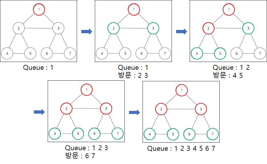 => 이러한 과정을 통해 1부터 가까운 노드들부터 탐색이 이루어진다