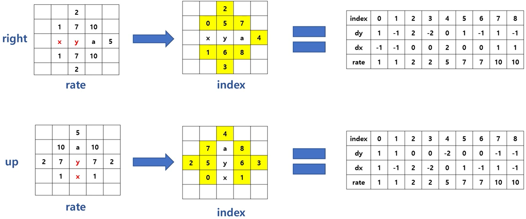 3. 아래 그림()을 참고하여 비율이 작은 순서대로 인덱스를 설정하여 'y'가 해당 좌표로 갈 수 있는 좌표 windx, windy를 정의한다.