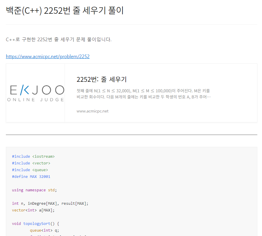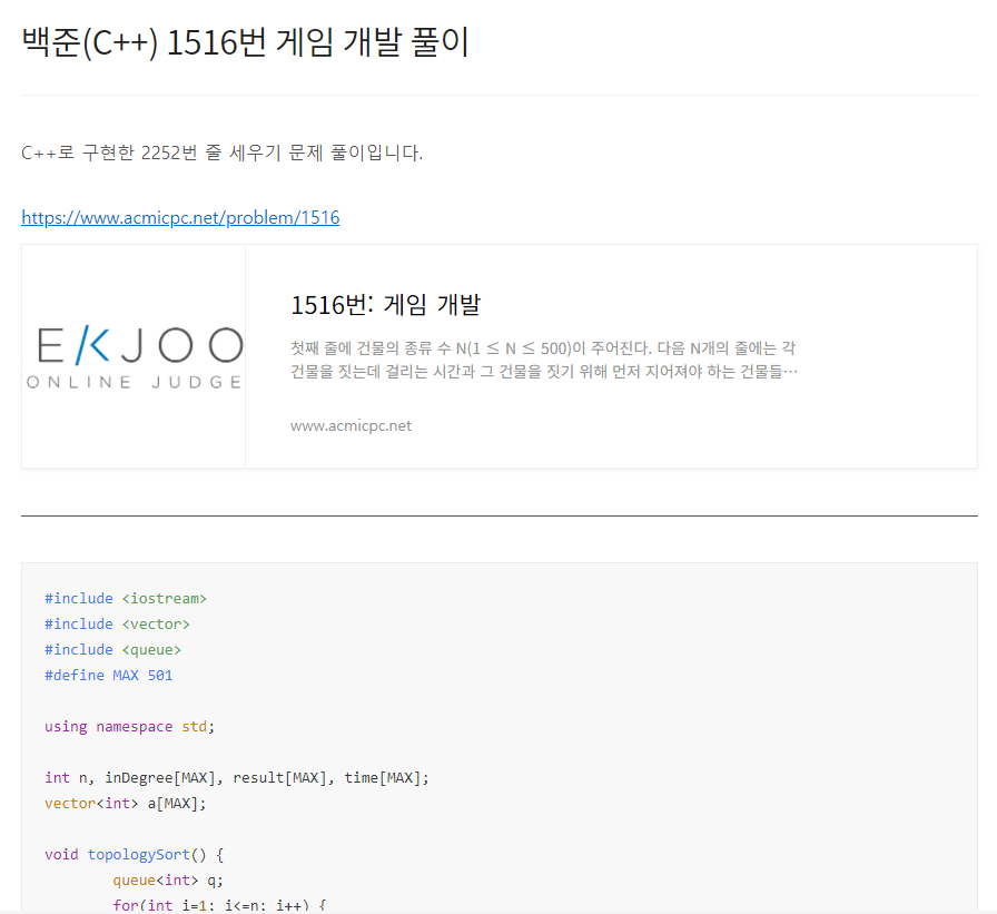 C++로 구현한 2252번 줄 세우기 문제 풀이입니다. https://www.acmicpc.net/problem/1516 1516번: 게임 개발 첫째 줄에 건물의 종류 수 N(1 ≤ N ≤ 500)이 주어진다. 다음 N개의 줄에는 각 건물을 짓는데 걸리는 시간과 그 건물을 짓기 위해 먼저 지어져야 하는 건물들의 번호가 주어진다. 건물의 번호는 1부 www.acmicpc.net #include #include #include #define MAX 501 using namespace std; int n, inDegree[MAX], result[MAX], time[MAX]; vector a[MAX]; void topologySort() { queue q; for(int i=1; i