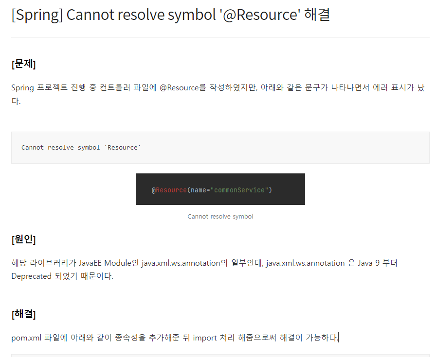 [문제] Spring 프로젝트 진행 중 컨트롤러 파일에 @Resource를 작성하였지만, 아래와 같은 문구가 나타나면서 에러 표시가 났다. Cannot resolve symbol 'Resource' [원인] 해당 라이브러리가 JavaEE Module인 java.xml.ws.annotation의 일부인데, java.xml.ws.annotation 은 Java 9 부터 Deprecated 되었기 때문이다. [해결] pom.xml 파일에 아래와 같이 종속성을 추가해준 뒤 import 처리 해줌으로써 해결이 가능하다. javax.annotation javax.annotation-api 1.3.2