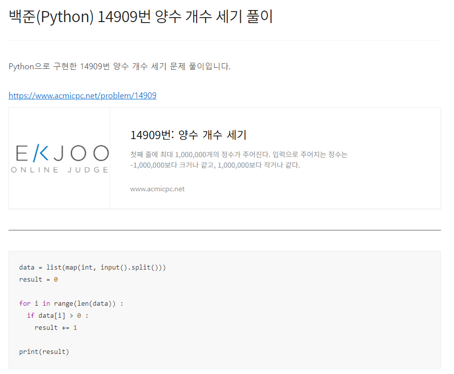 Python으로 구현한 14909번 양수 개수 세기 문제 풀이입니다. https://www.acmicpc.net/problem/14909 14909번: 양수 개수 세기 첫째 줄에 최대 1,000,000개의 정수가 주어진다. 입력으로 주어지는 정수는 -1,000,000보다 크거나 같고, 1,000,000보다 작거나 같다. www.acmicpc.net data = list(map(int, input().split())) result = 0 for i in range(len(data)) : if data[i] > 0 : result += 1 print(result) 1. 정수들을 입력받아 리스트 형태로 구성한다. 2. 반복문을 통해 data 리스트에 담겨있는 값들을 하나씩 확인하여 그 수가 0보다 클 경우 즉..