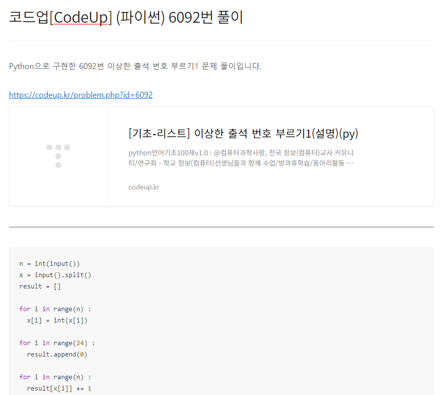Java로 구현한 1093번 이상한 출석 번호 부르기1 문제 풀이입니다. https://codeup.kr/problem.php?id=1093 [기초-1차원배열] 이상한 출석 번호 부르기1(설명) C언어기초100제v1.2 : @컴퓨터과학사랑, 전국 정보(컴퓨터)교사 커뮤니티/연구회 - 학교 정보(컴퓨터)선생님들과 함께 수업/방과후학습/동아리활동 등을 통해 재미있게 배워보세요. - 모든 내용 codeup.kr import java.util.Scanner; public class Main { public static void main(String[] args) { Scanner sc = new Scanner(System.in); int n = sc.nextInt(); int[] data = new int[24..