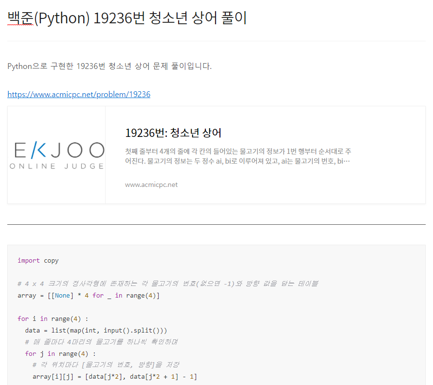 Python으로 구현한 19236번 청소년 상어 문제 풀이입니다. https://www.acmicpc.net/problem/19236 19236번: 청소년 상어 첫째 줄부터 4개의 줄에 각 칸의 들어있는 물고기의 정보가 1번 행부터 순서대로 주어진다. 물고기의 정보는 두 정수 ai, bi로 이루어져 있고, ai는 물고기의 번호, bi는 방향을 의미한다. 방향 bi는 www.acmicpc.net import copy # 4 x 4 크기의 정사각형에 존재하는 각 물고기의 번호(없으면 -1)와 방향 값을 담는 테이블 array = [[None] * 4 for _ in range(4)] for i in range(4) : data = list(map(int, input().split())) # 매 줄마다 4마리..