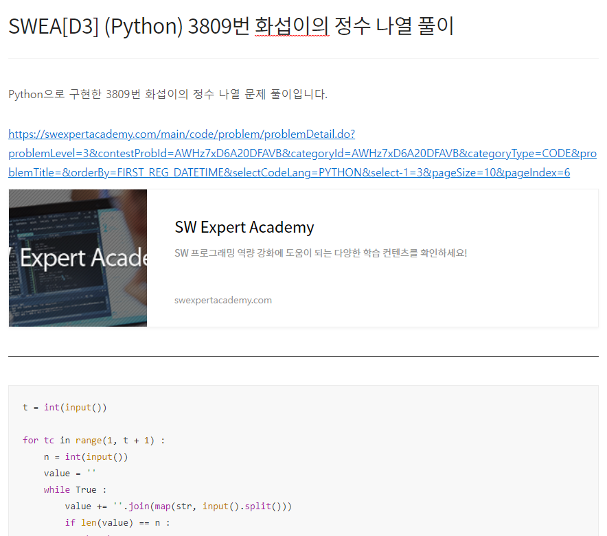 Python으로 구현한 3809번 화섭이의 정수 나열 문제 풀이입니다. https://swexpertacademy.com/main/code/problem/problemDetail.do?problemLevel=3&contestProbId=AWHz7xD6A20DFAVB&categoryId=AWHz7xD6A20DFAVB&categoryType=CODE&problemTitle=&orderBy=FIRST_REG_DATETIME&selectCodeLang=PYTHON&select-1=3&pageSize=10&pageIndex=6 SW Expert Academy SW 프로그래밍 역량 강화에 도움이 되는 다양한 학습 컨텐츠를 확인하세요! swexpertacademy.com t = int(input()) for tc i..