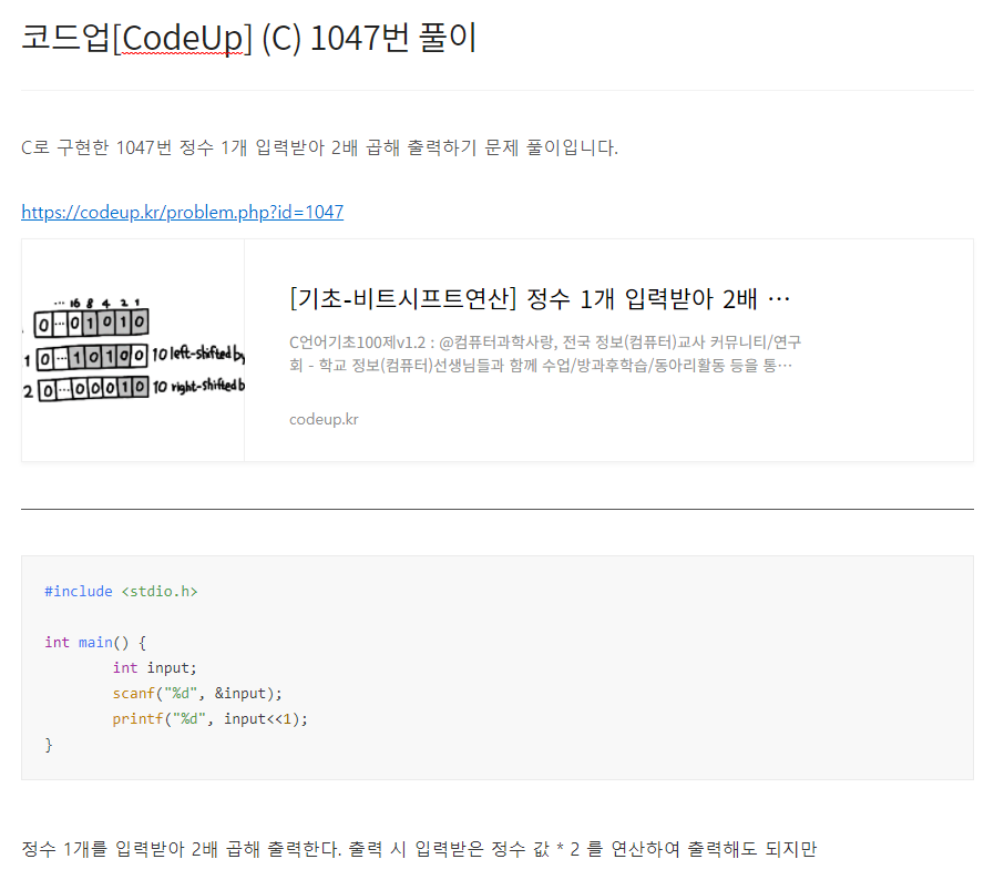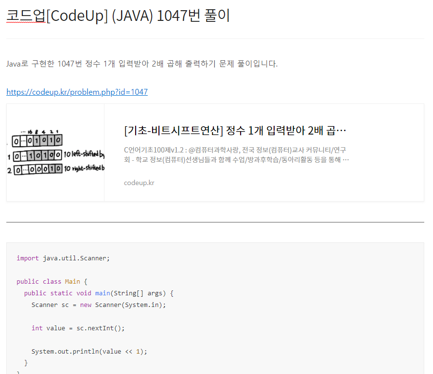 Java로 구현한 1047번 정수 1개 입력받아 2배 곱해 출력하기 문제 풀이입니다. https://codeup.kr/problem.php?id=1047 [기초-비트시프트연산] 정수 1개 입력받아 2배 곱해 출력하기(설명) C언어기초100제v1.2 : @컴퓨터과학사랑, 전국 정보(컴퓨터)교사 커뮤니티/연구회 - 학교 정보(컴퓨터)선생님들과 함께 수업/방과후학습/동아리활동 등을 통해 재미있게 배워보세요. - 모든 내용 codeup.kr import java.util.Scanner; public class Main { public static void main(String[] args) { Scanner sc = new Scanner(System.in); int value = sc.nextInt(); Sys..