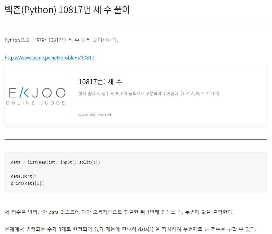 Python으로 구현한 10817번 세 수 문제 풀이입니다. https://www.acmicpc.net/problem/10817 10817번: 세 수 첫째 줄에 세 정수 A, B, C가 공백으로 구분되어 주어진다. (1 ≤ A, B, C ≤ 100) www.acmicpc.net data = list(map(int, input().split())) data.sort() print(data[1]) 세 정수를 입력받아 data 리스트에 담아 오름차순으로 정렬한 뒤 1번째 인덱스 즉, 두번째 값을 출력한다. 문제에서 입력되는 수가 3개로 한정되어 있기 때문에 단순히 data[1] 을 작성하여 두번째로 큰 정수를 구할 수 있다.