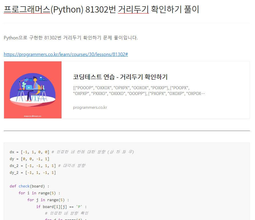 Python으로 구현한 81302번 거리두기 확인하기 문제 풀이입니다. https://programmers.co.kr/learn/courses/30/lessons/81302# 코딩테스트 연습 - 거리두기 확인하기 [["POOOP", "OXXOX", "OPXPX", "OOXOX", "POXXP"], ["POOPX", "OXPXP", "PXXXO", "OXXXO", "OOOPP"], ["PXOPX", "OXOXP", "OXPOX", "OXXOP", "PXPOX"], ["OOOXX", "XOOOX", "OOOXX", "OXOOX", "OOOOO"], ["PXPXP", "XPXPX", "PXPXP", "XPXPX", "PXPXP"]] [1, 0, 1, 1, 1] programmers.co.kr dx = [-1,..