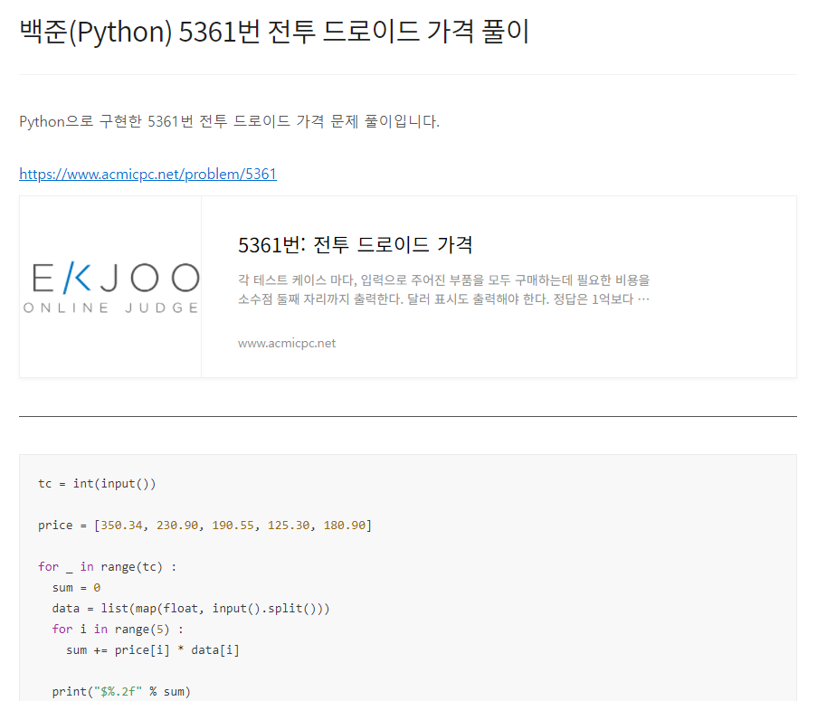 Python으로 구현한 5361번 전투 드로이드 가격 문제 풀이입니다. https://www.acmicpc.net/problem/5361 5361번: 전투 드로이드 가격 각 테스트 케이스 마다, 입력으로 주어진 부품을 모두 구매하는데 필요한 비용을 소수점 둘째 자리까지 출력한다. 달러 표시도 출력해야 한다. 정답은 1억보다 작거나 같다. www.acmicpc.net tc = int(input()) price = [350.34, 230.90, 190.55, 125.30, 180.90] for _ in range(tc) : sum = 0 data = list(map(float, input().split())) for i in range(5) : sum += price[i] * data[i] print("$%..
