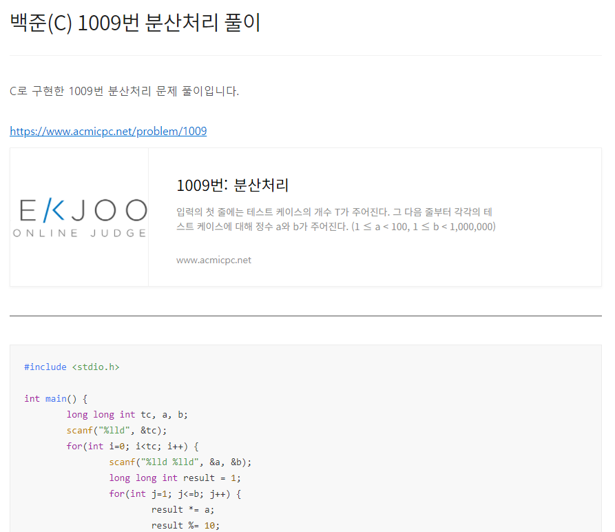 C로 구현한 1009번 분산처리 문제 풀이입니다. https://www.acmicpc.net/problem/1009 1009번: 분산처리 입력의 첫 줄에는 테스트 케이스의 개수 T가 주어진다. 그 다음 줄부터 각각의 테스트 케이스에 대해 정수 a와 b가 주어진다. (1 ≤ a < 100, 1 ≤ b < 1,000,000) www.acmicpc.net #include int main() { long long int tc, a, b; scanf("%lld", &tc); for(int i=0; i