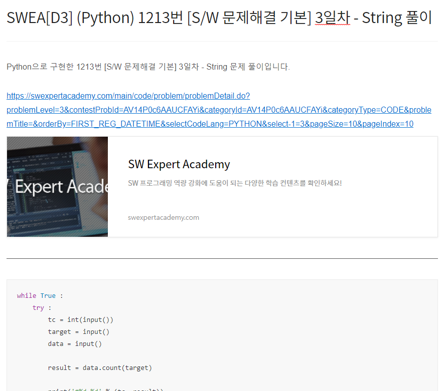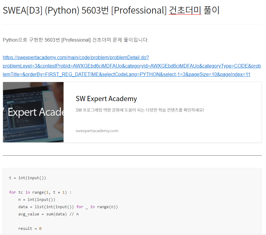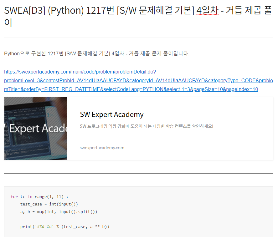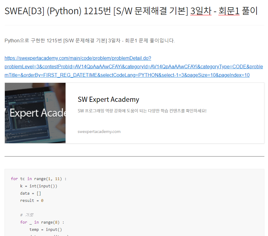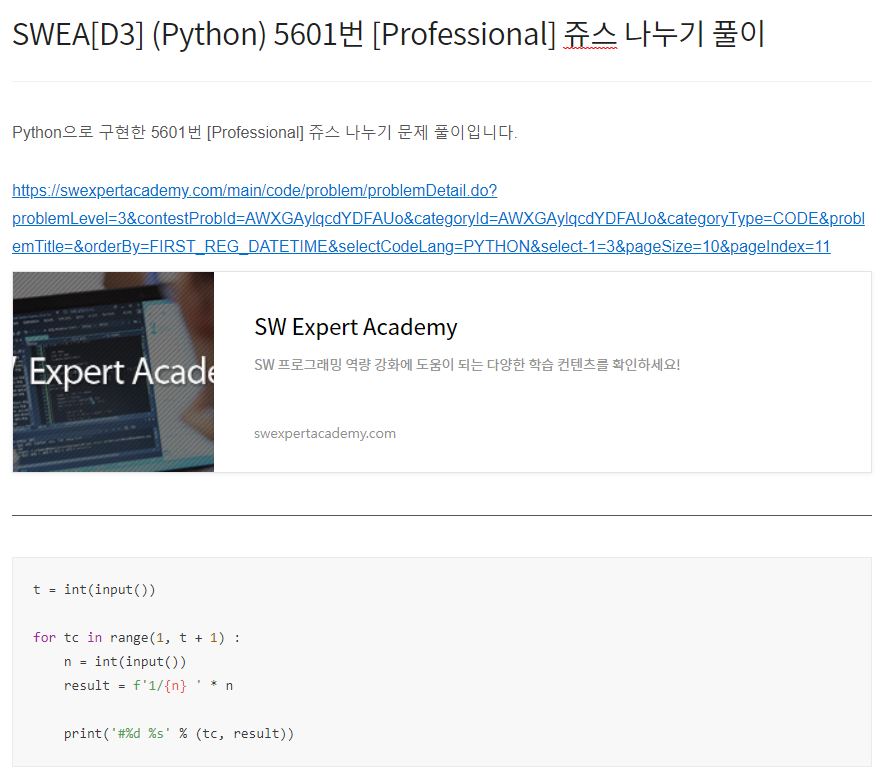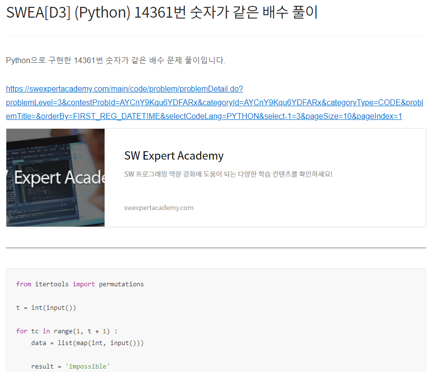 Python으로 구현한 14361번 숫자가 같은 배수 문제 풀이입니다. https://swexpertacademy.com/main/code/problem/problemDetail.do?problemLevel=3&contestProbId=AYCnY9Kqu6YDFARx&categoryId=AYCnY9Kqu6YDFARx&categoryType=CODE&problemTitle=&orderBy=FIRST_REG_DATETIME&selectCodeLang=PYTHON&select-1=3&pageSize=10&pageIndex=1 SW Expert Academy SW 프로그래밍 역량 강화에 도움이 되는 다양한 학습 컨텐츠를 확인하세요! swexpertacademy.com from itertools import per..