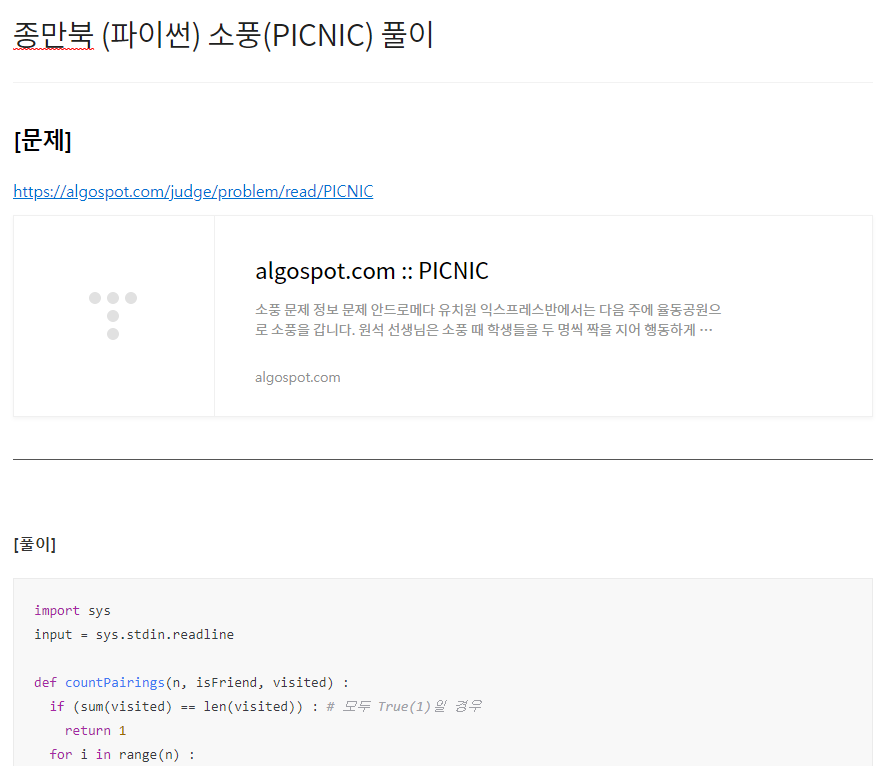 [문제] https://algospot.com/judge/problem/read/PICNIC algospot.com :: PICNIC 소풍 문제 정보 문제 안드로메다 유치원 익스프레스반에서는 다음 주에 율동공원으로 소풍을 갑니다. 원석 선생님은 소풍 때 학생들을 두 명씩 짝을 지어 행동하게 하려고 합니다. 그런데 서로 algospot.com [풀이] import sys input = sys.stdin.readline def countPairings(n, isFriend, visited) : if (sum(visited) == len(visited)) : # 모두 True(1)일 경우 return 1 for i in range(n) : if (not visited[i]) : break firstFree =..