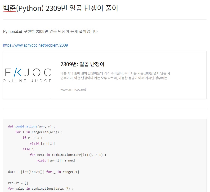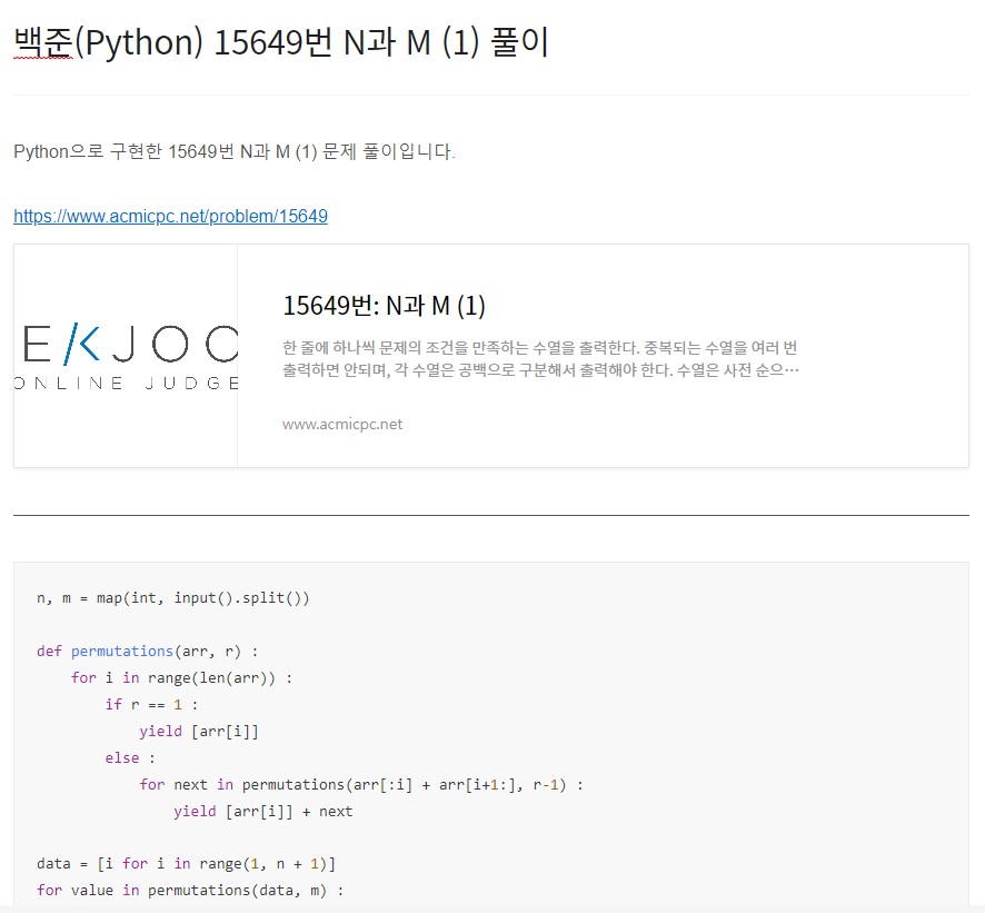 Python으로 구현한 15649번 N과 M (1) 문제 풀이입니다. https://www.acmicpc.net/problem/15649 15649번: N과 M (1) 한 줄에 하나씩 문제의 조건을 만족하는 수열을 출력한다. 중복되는 수열을 여러 번 출력하면 안되며, 각 수열은 공백으로 구분해서 출력해야 한다. 수열은 사전 순으로 증가하는 순서로 출력해 www.acmicpc.net n, m = map(int, input().split()) def permutations(arr, r) : for i in range(len(arr)) : if r == 1 : yield [arr[i]] else : for next in permutations(arr[:i] + arr[i+1:], r-1) : yield [ar..