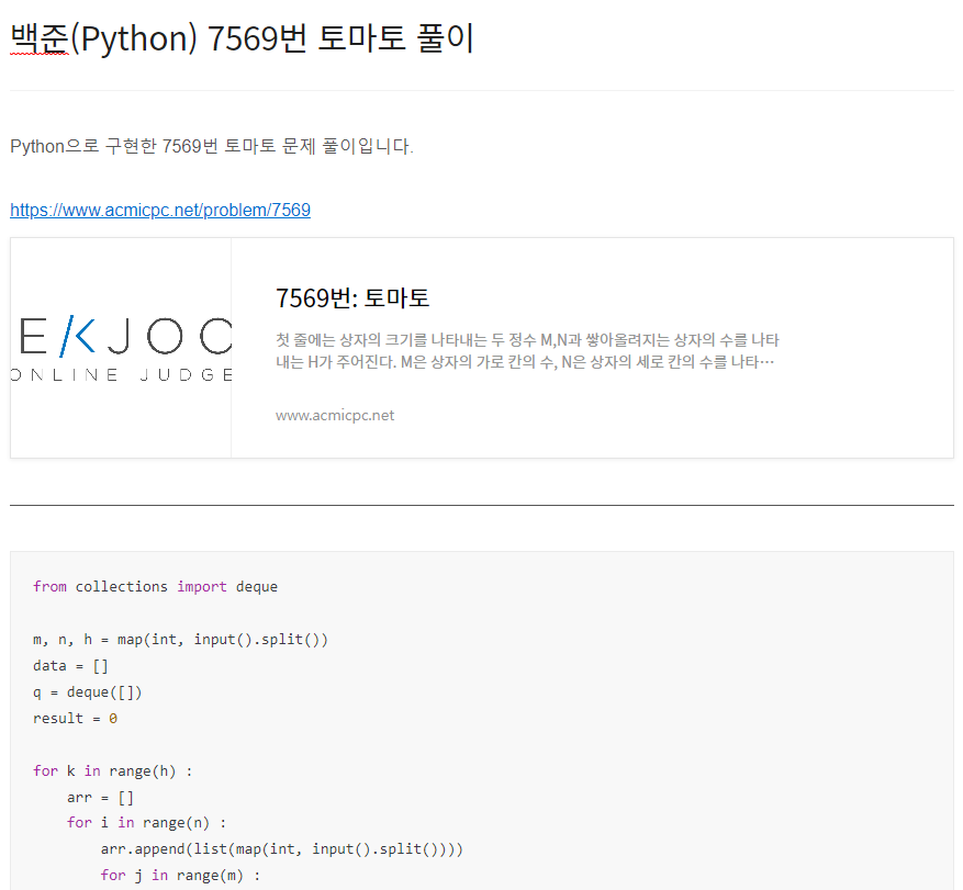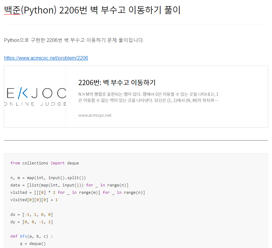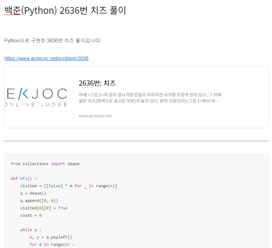 Python으로 구현한 2636번 치즈 풀이입니다. https://www.acmicpc.net/problem/2636 2636번: 치즈 아래 과 같이 정사각형 칸들로 이루어진 사각형 모양의 판이 있고, 그 위에 얇은 치즈(회색으로 표시된 부분)가 놓여 있다. 판의 가장자리(에서 네모 칸에 X친 부분)에는 치즈가 놓 www.acmicpc.net from collections import deque def bfs() : visited = [[False] * m for _ in range(n)] q = deque() q.append([0, 0]) visited[0][0] = True count = 0 while q : x, y = q.popleft() for d in range(4) : nx = x + dx[..