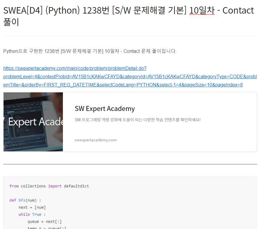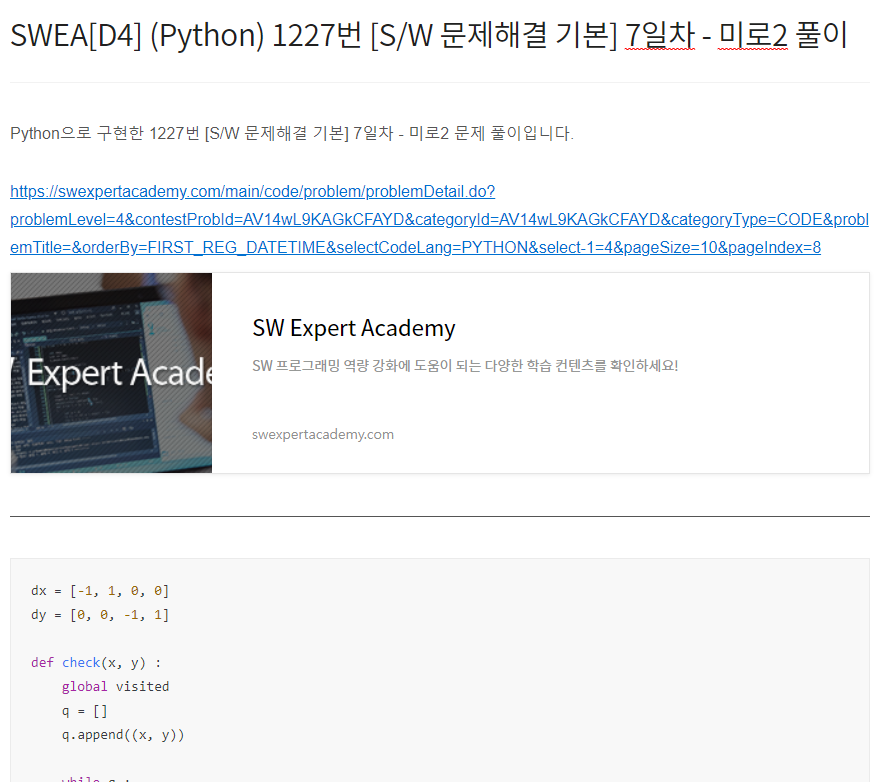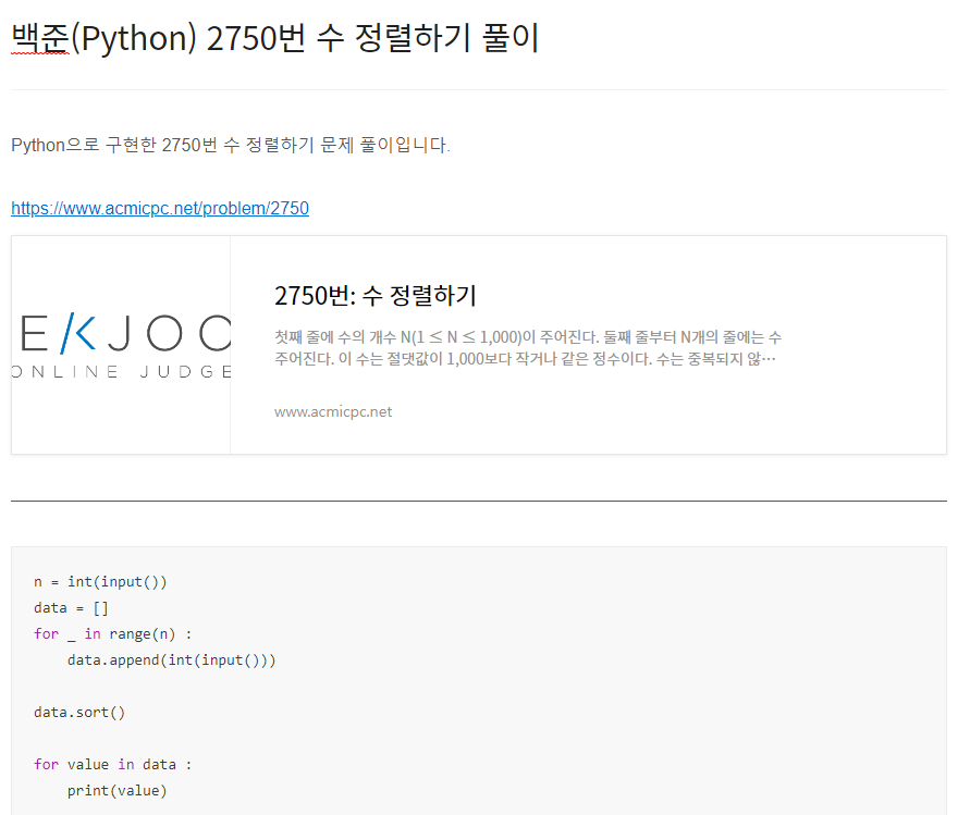 Python으로 구현한 2750번 수 정렬하기 문제 풀이입니다. https://www.acmicpc.net/problem/2750 2750번: 수 정렬하기 첫째 줄에 수의 개수 N(1 ≤ N ≤ 1,000)이 주어진다. 둘째 줄부터 N개의 줄에는 수 주어진다. 이 수는 절댓값이 1,000보다 작거나 같은 정수이다. 수는 중복되지 않는다. www.acmicpc.net n = int(input()) data = [] for _ in range(n) : data.append(int(input())) data.sort() for value in data : print(value) 1. n개의 수를 입력받아 data 리스트에 저장한다. 2. data 리스트에 존재하는 값들을 오름차순으로 정렬한다. 3. data ..