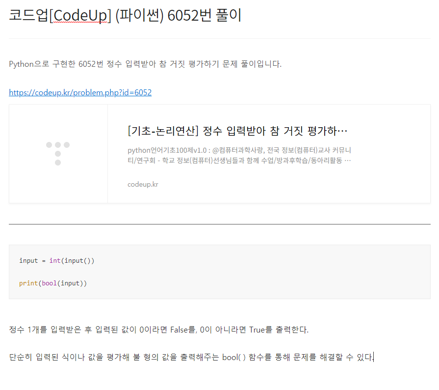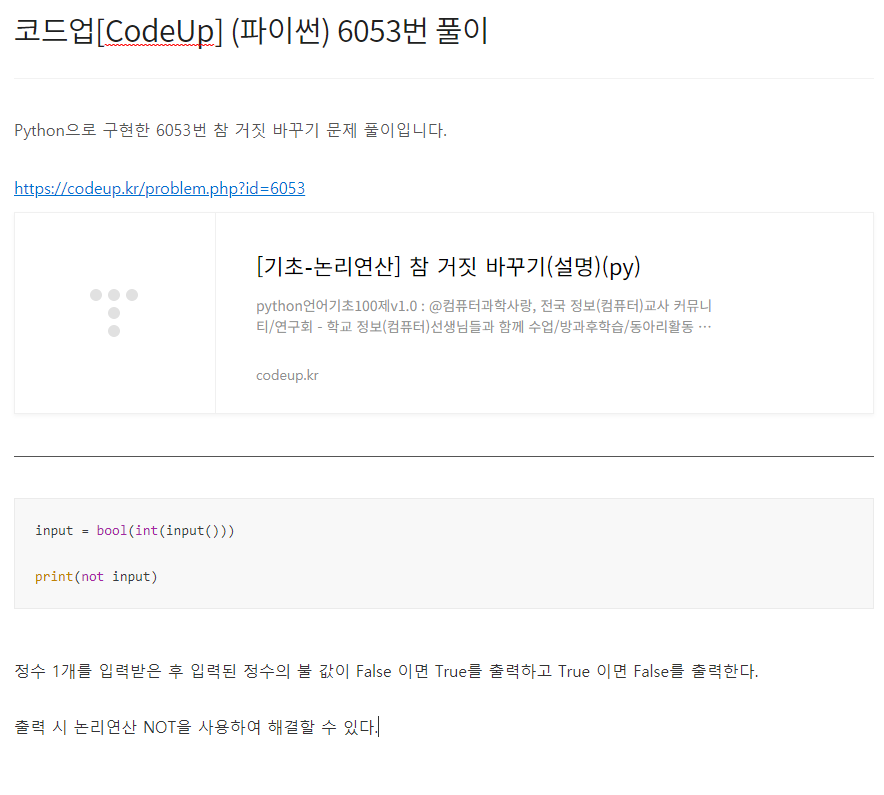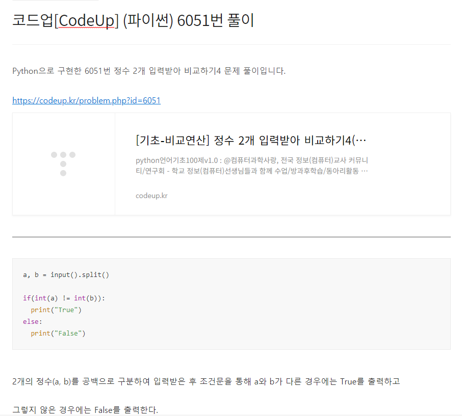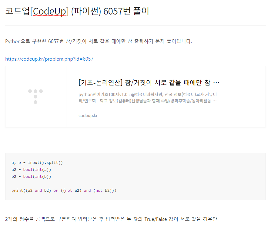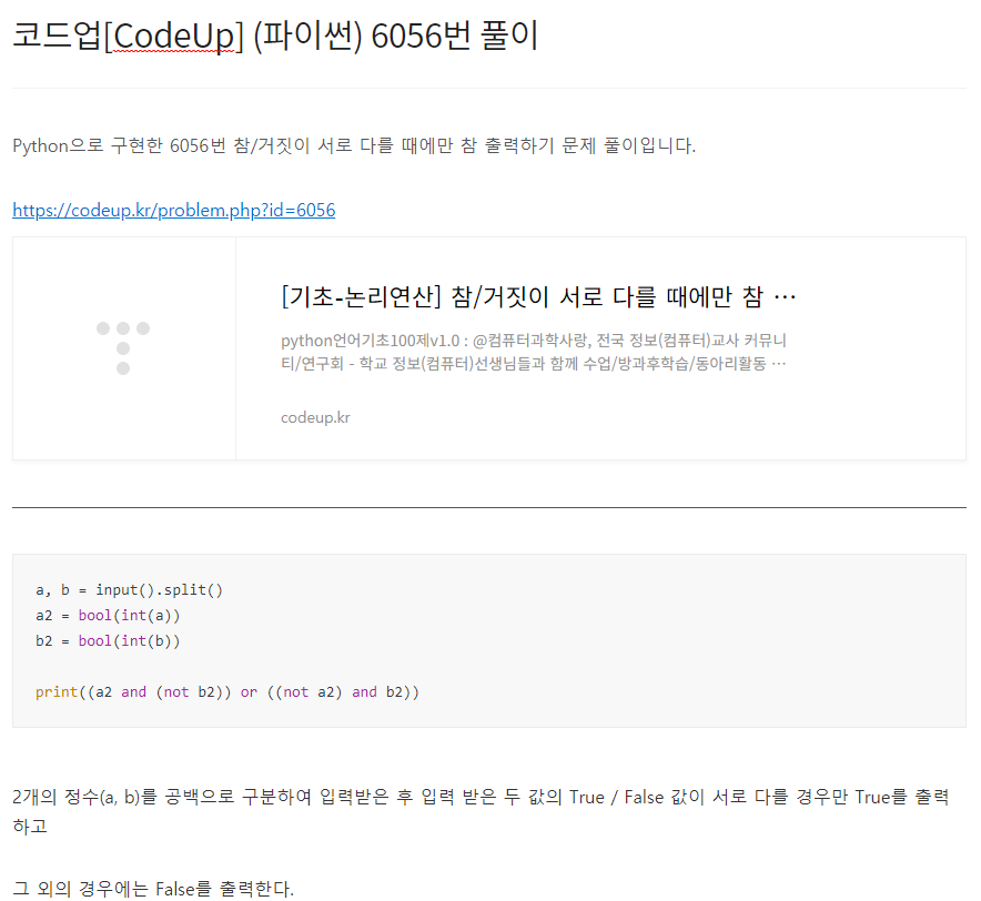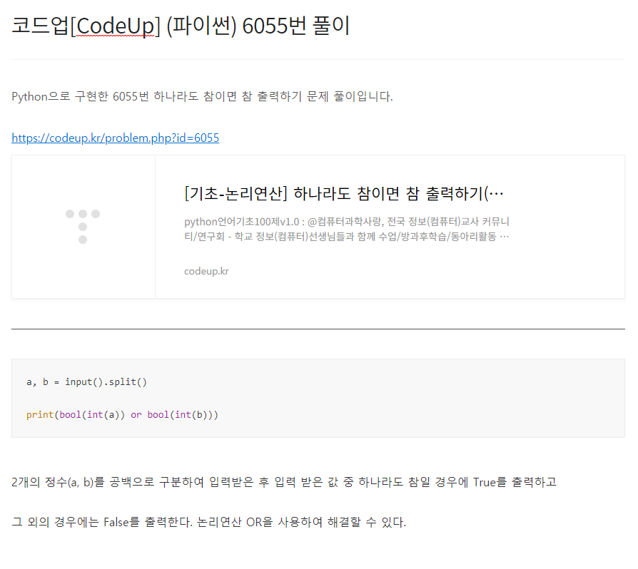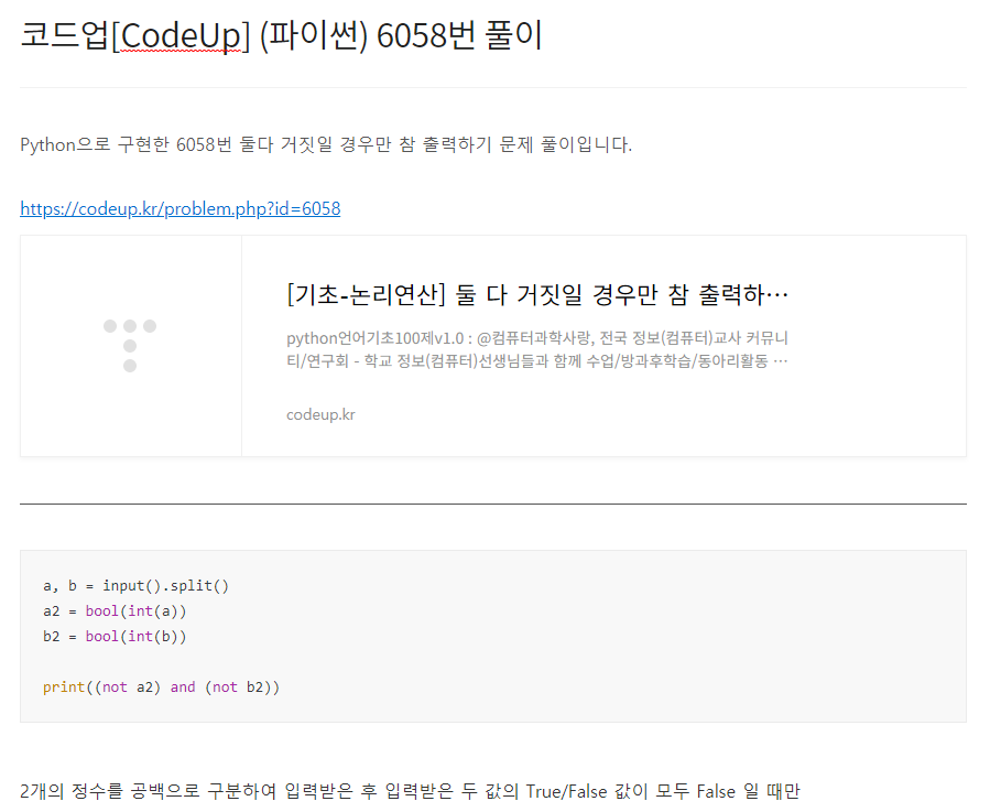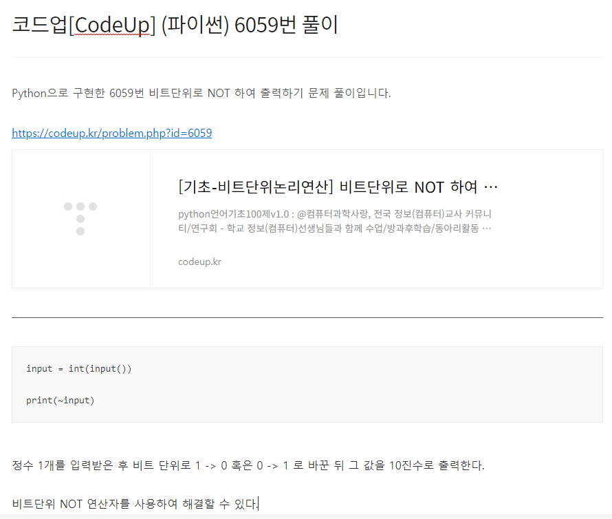 Python으로 구현한 6060번 비트단위로 AND 하여 출력하기 문제 풀이입니다. https://codeup.kr/problem.php?id=6060 [기초-비트단위논리연산] 비트단위로 AND 하여 출력하기(설명)(py) python언어기초100제v1.0 : @컴퓨터과학사랑, 전국 정보(컴퓨터)교사 커뮤니티/연구회 - 학교 정보(컴퓨터)선생님들과 함께 수업/방과후학습/동아리활동 등을 통해 재미있게 배워보세요. - 모든 내용 codeup.kr a, b = input().split() result = int(a) & int(b) print(result) 2개의 정수를 공백으로 구분하여 입력받은 후 두 정수를 비트단위(bitwise)로 AND 계산을 수행한 결과를 10진수로 출력한다.