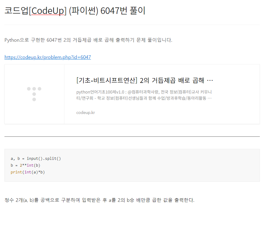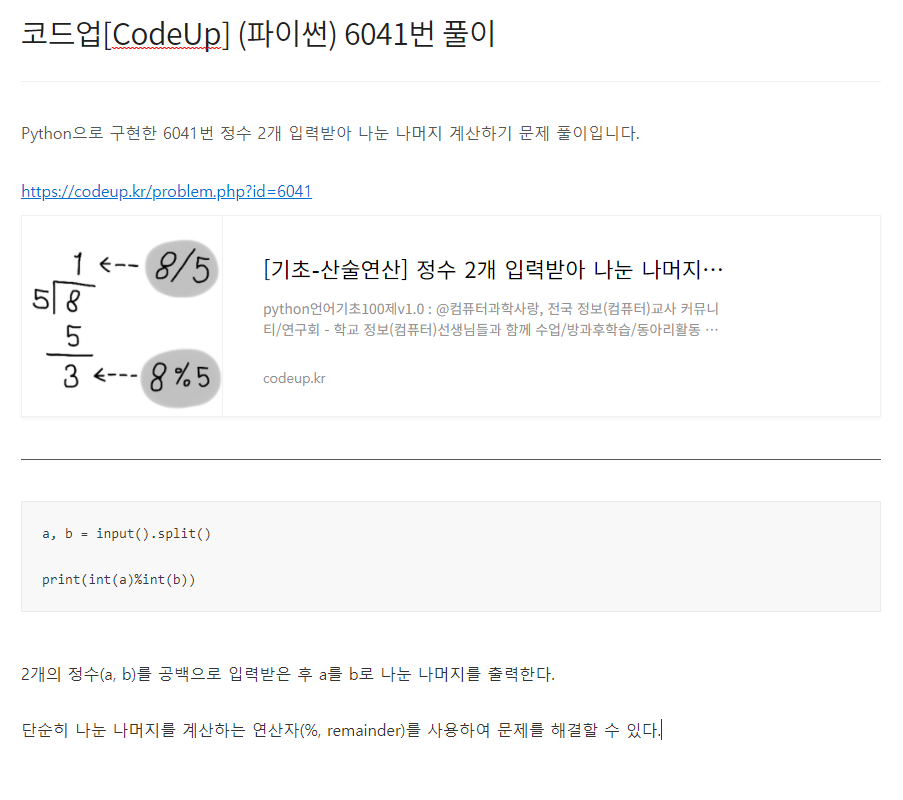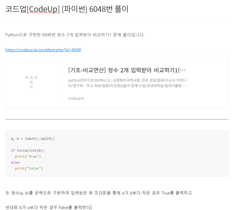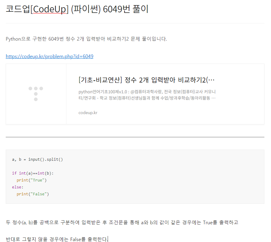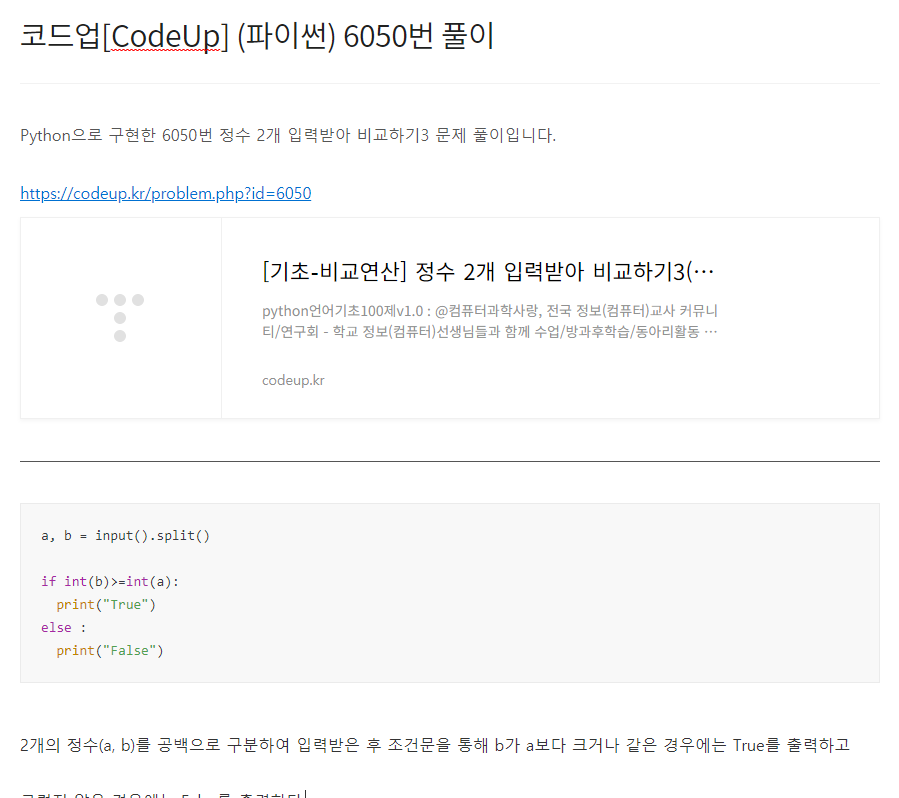 Python으로 구현한 6050번 정수 2개 입력받아 비교하기3 문제 풀이입니다. https://codeup.kr/problem.php?id=6050 [기초-비교연산] 정수 2개 입력받아 비교하기3(설명)(py) python언어기초100제v1.0 : @컴퓨터과학사랑, 전국 정보(컴퓨터)교사 커뮤니티/연구회 - 학교 정보(컴퓨터)선생님들과 함께 수업/방과후학습/동아리활동 등을 통해 재미있게 배워보세요. - 모든 내용 codeup.kr a, b = input().split() if int(b)>=int(a): print("True") else : print("False") 2개의 정수(a, b)를 공백으로 구분하여 입력받은 후 조건문을 통해 b가 a보다 크거나 같은 경우에는 True를 출력하고 그렇지 않은 ..