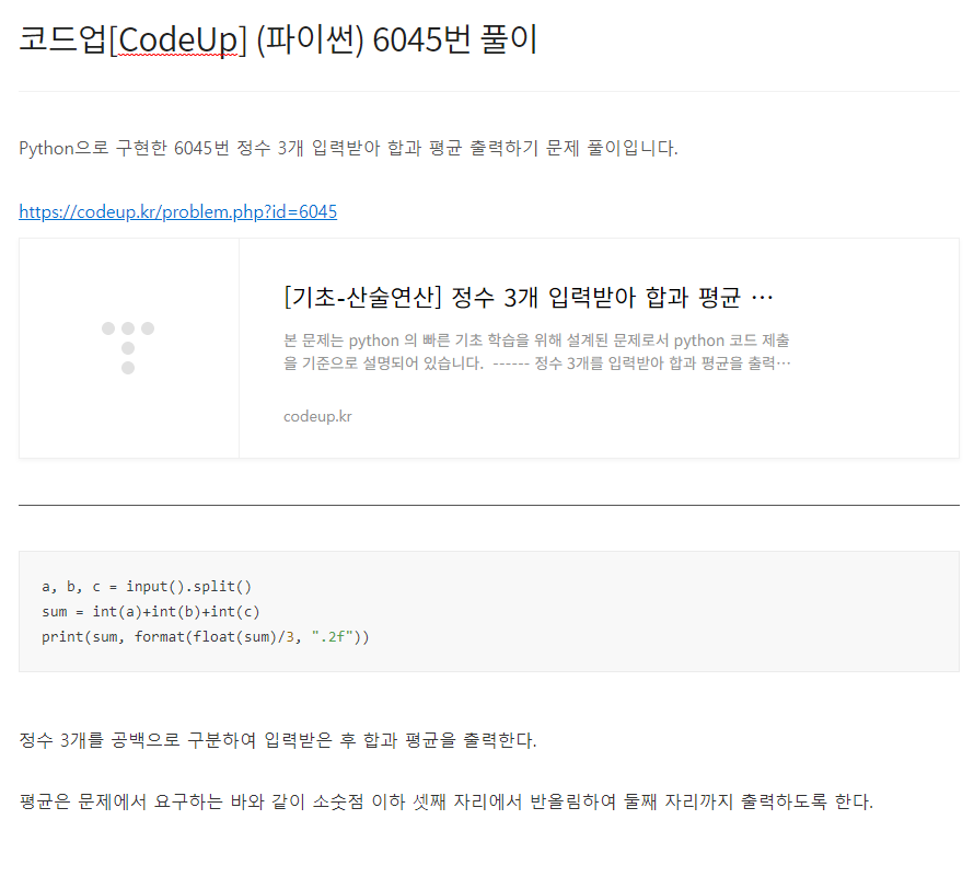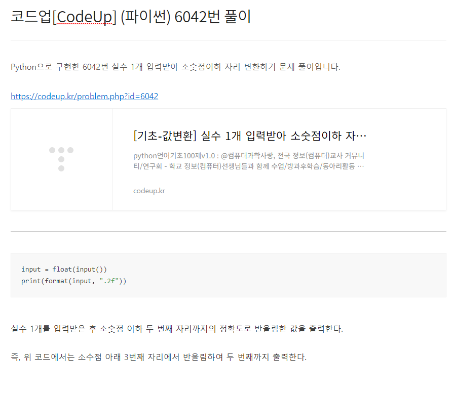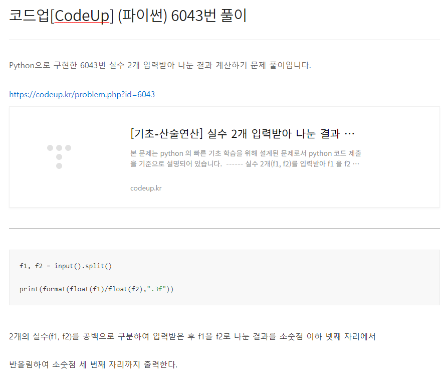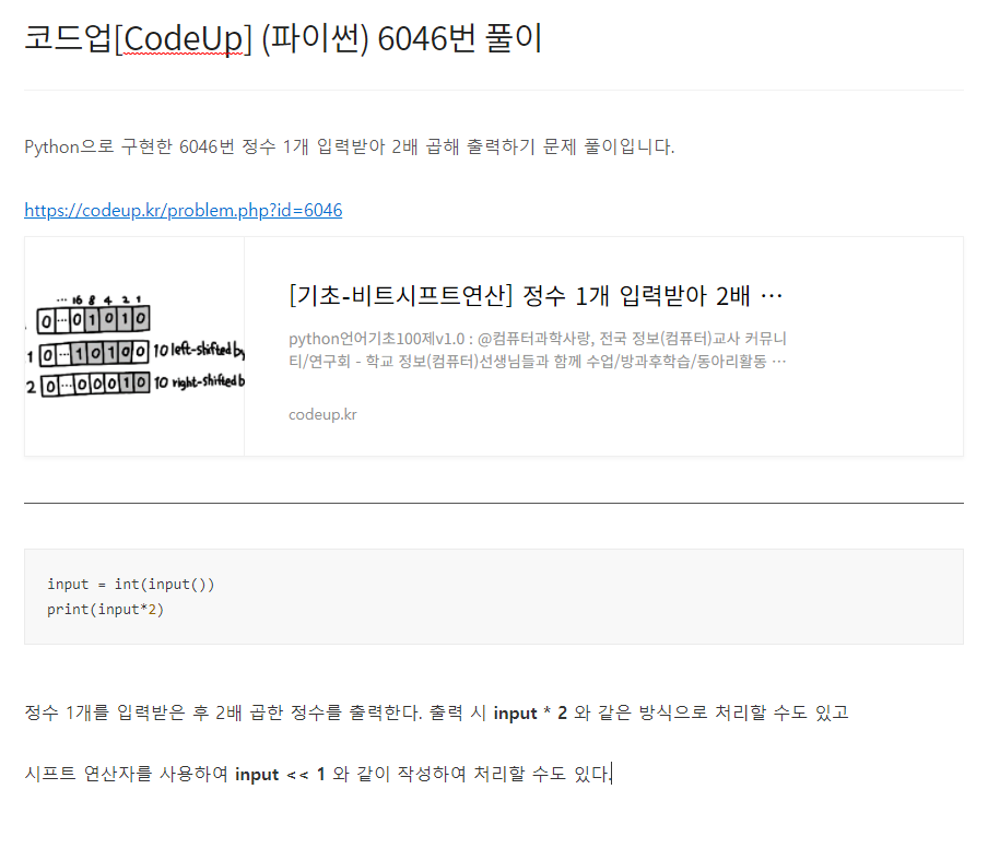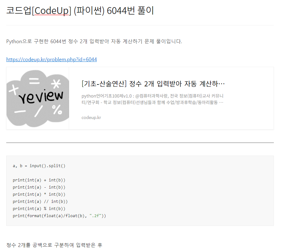 Python으로 구현한 6050번 정수 2개 입력받아 비교하기3 문제 풀이입니다. https://codeup.kr/problem.php?id=6050 [기초-비교연산] 정수 2개 입력받아 비교하기3(설명)(py) python언어기초100제v1.0 : @컴퓨터과학사랑, 전국 정보(컴퓨터)교사 커뮤니티/연구회 - 학교 정보(컴퓨터)선생님들과 함께 수업/방과후학습/동아리활동 등을 통해 재미있게 배워보세요. - 모든 내용 codeup.kr a, b = input().split() if int(b)>=int(a): print("True") else : print("False") 2개의 정수(a, b)를 공백으로 구분하여 입력받은 후 조건문을 통해 b가 a보다 크거나 같은 경우에는 True를 출력하고 그렇지 않은 ..