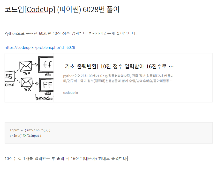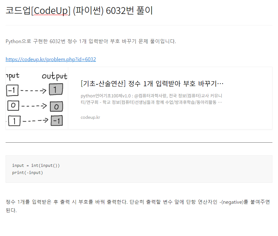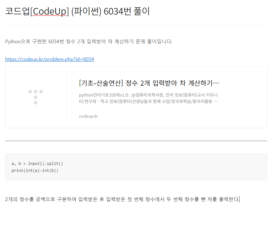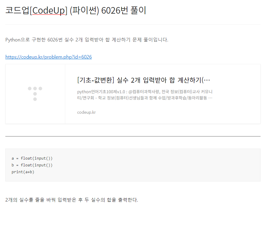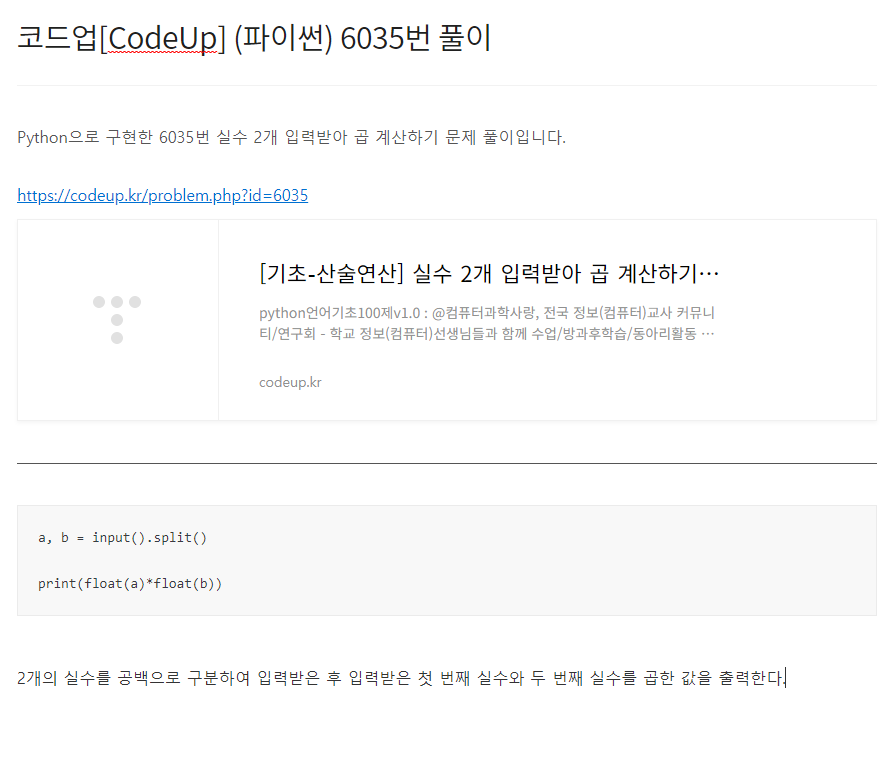Python으로 구현한 6035번 실수 2개 입력받아 곱 계산하기 문제 풀이입니다. https://codeup.kr/problem.php?id=6035 [기초-산술연산] 실수 2개 입력받아 곱 계산하기(설명)(py) python언어기초100제v1.0 : @컴퓨터과학사랑, 전국 정보(컴퓨터)교사 커뮤니티/연구회 - 학교 정보(컴퓨터)선생님들과 함께 수업/방과후학습/동아리활동 등을 통해 재미있게 배워보세요. - 모든 내용 codeup.kr a, b = input().split() print(float(a)*float(b)) 2개의 실수를 공백으로 구분하여 입력받은 후 입력받은 첫 번째 실수와 두 번째 실수를 곱한 값을 출력한다.