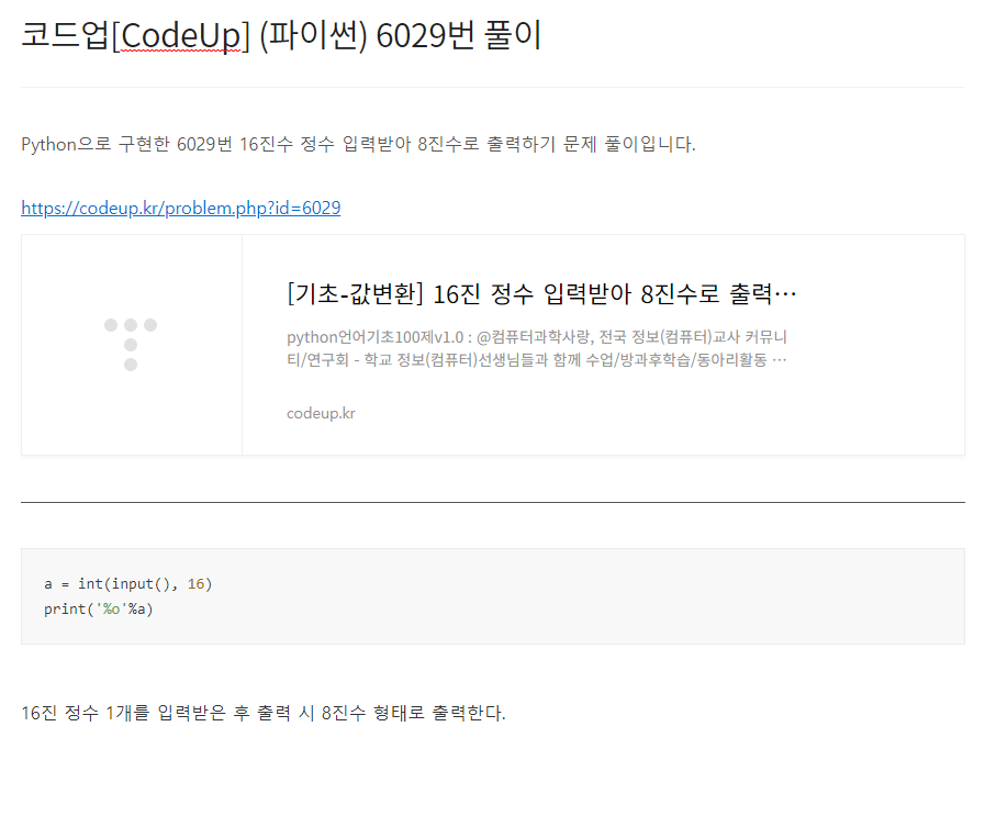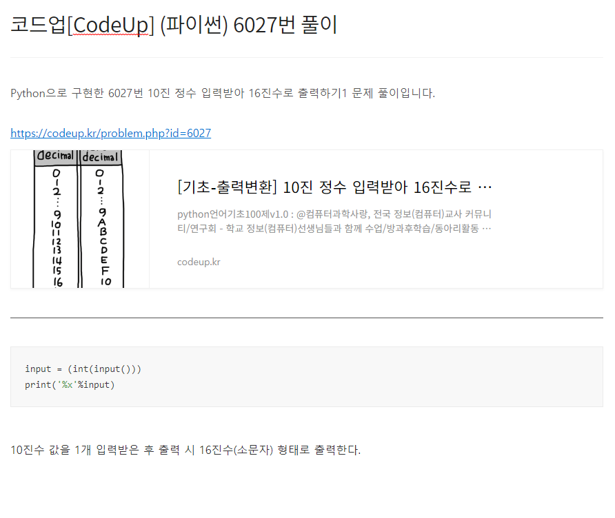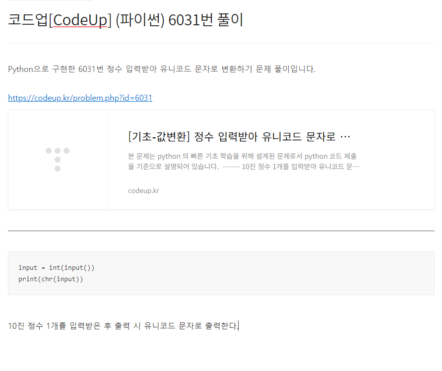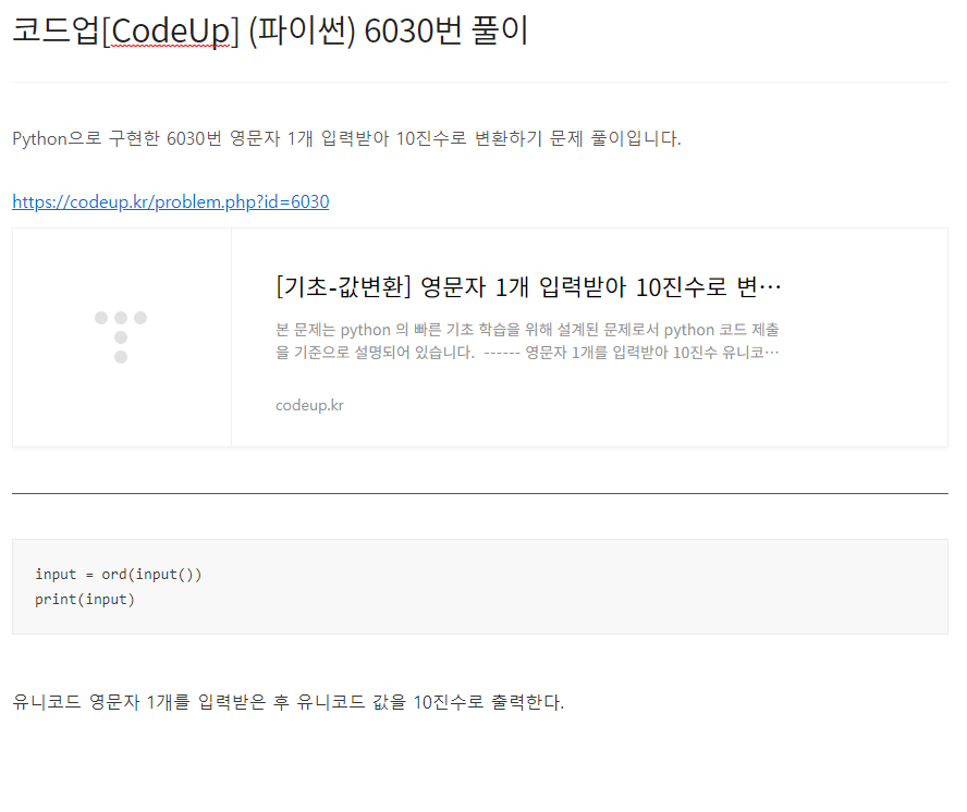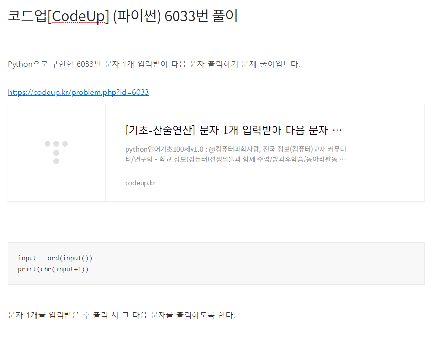 Python으로 구현한 6035번 실수 2개 입력받아 곱 계산하기 문제 풀이입니다. https://codeup.kr/problem.php?id=6035 [기초-산술연산] 실수 2개 입력받아 곱 계산하기(설명)(py) python언어기초100제v1.0 : @컴퓨터과학사랑, 전국 정보(컴퓨터)교사 커뮤니티/연구회 - 학교 정보(컴퓨터)선생님들과 함께 수업/방과후학습/동아리활동 등을 통해 재미있게 배워보세요. - 모든 내용 codeup.kr a, b = input().split() print(float(a)*float(b)) 2개의 실수를 공백으로 구분하여 입력받은 후 입력받은 첫 번째 실수와 두 번째 실수를 곱한 값을 출력한다.