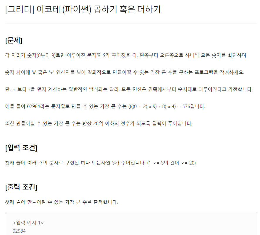 [문제] 각 자리가 숫자(0부터 9)로만 이루어진 문자열 S가 주어졌을 때, 왼쪽부터 오른쪽으로 하나씩 모든 숫자를 확인하며 숫자 사이에 'x' 혹은 '+' 연산자를 넣어 결과적으로 만들어질 수 있는 가장 큰 수를 구하는 프로그램을 작성하세요. 단, + 보다 x를 먼저 계산하는 일반적인 방식과는 달리, 모든 연산은 왼쪽에서부터 순서대로 이루어진다고 가정합니다. 예를 들어 02984라는 문자열로 만들 수 있는 가장 큰 수는 ((((0 + 2) x 9) x 8) x 4) = 576입니다. 또한 만들어질 수 있는 가장 큰 수는 항상 20억 이하의 정수가 되도록 입력이 주어집니다. [입력 조건] 첫째 줄에 여러 개의 숫자로 구성된 하나의 문자열 S가 주어집니다. (1