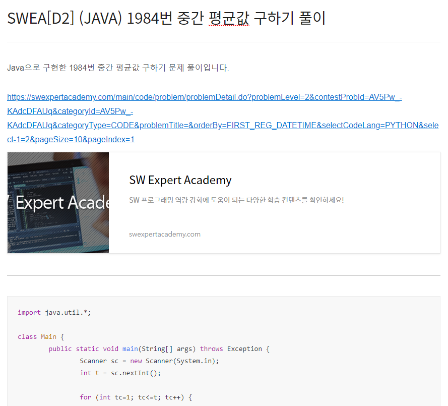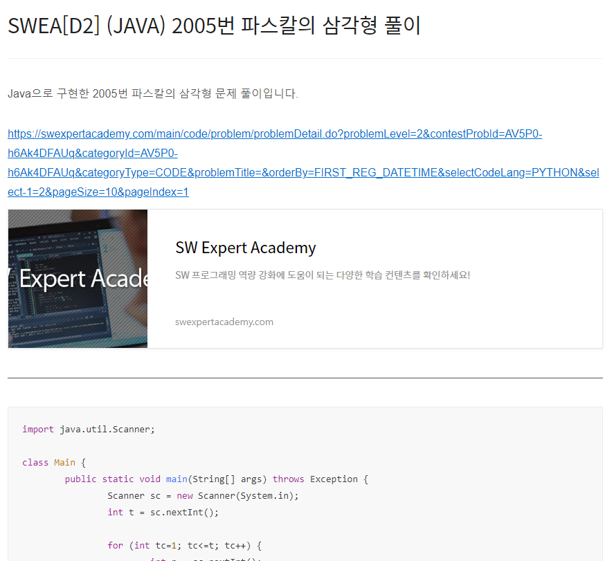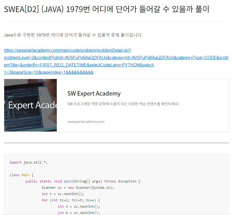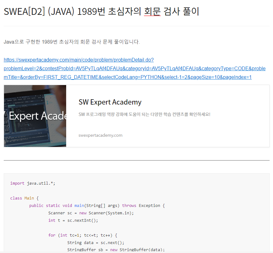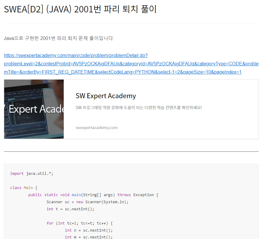 Java으로 구현한 1966번 숫자를 정렬하자 문제 풀이입니다. https://swexpertacademy.com/main/code/problem/problemDetail.do?problemLevel=2&contestProbId=AV5PrmyKAWEDFAUq&categoryId=AV5PrmyKAWEDFAUq&categoryType=CODE&problemTitle=&orderBy=FIRST_REG_DATETIME&selectCodeLang=PYTHON&select-1=2&pageSize=10&pageIndex=2 SW Expert Academy SW 프로그래밍 역량 강화에 도움이 되는 다양한 학습 컨텐츠를 확인하세요! swexpertacademy.com import java.util.*; class Mai..
