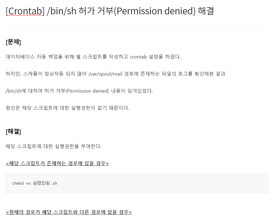 [문제] 데이터베이스 자동 백업을 위해 쉘 스크립트를 작성하고 crontab 설정을 하였다. 하지만, 스케줄이 정상작동 되지 않아 /var/spool/mail 경로에 존재하는 파일의 로그를 확인해본 결과 /bin/sh에 대하여 bad interpreter 내용이 담겨있었다. /bin/sh^M: bad interpreter: No such file or directory 원인은 윈도우에서 해당 스크립트 파일을 만들거나 수정한 뒤, 파일을 가져와 실행했기 때문이다. 즉, 스크립트 파일 내 각 행에 대한 줄바꿈의 개행문자가 윈도우와 다르기 때문에 발생한다. [해결] 해당 스크립트 파일을 바이너리 모드로 열고 ^M 문자를 지워준 뒤 저장한다. vi -b 실행파일.sh