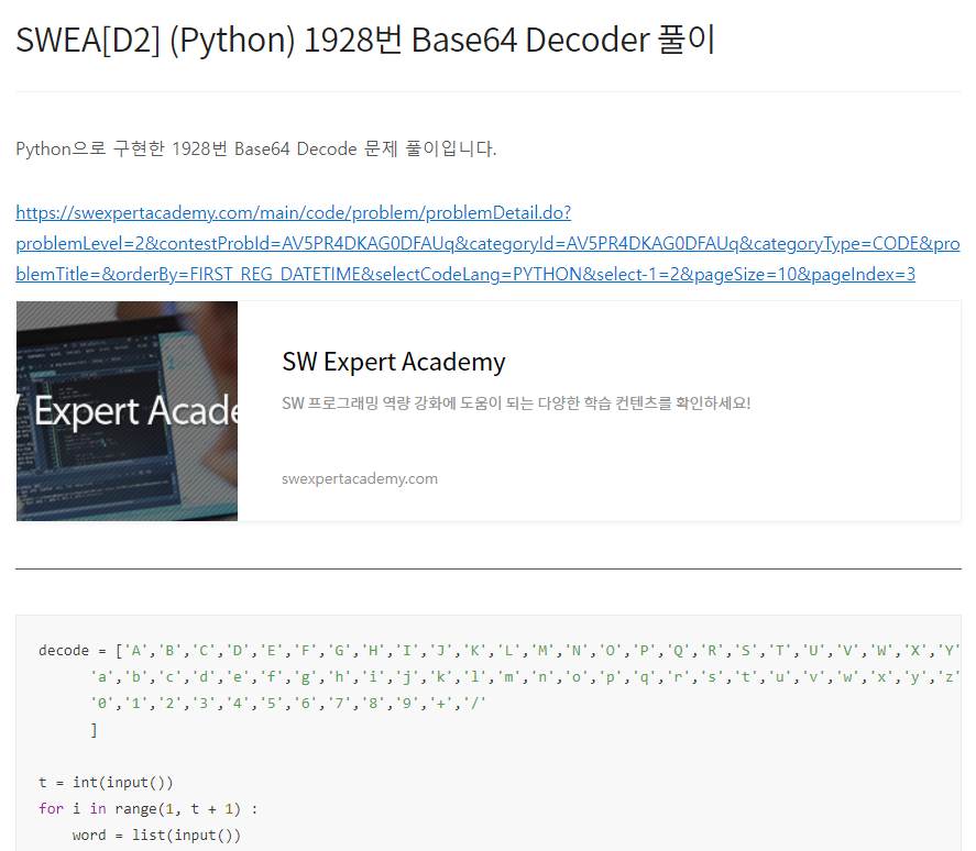 Python으로 구현한 1928번 Base64 Decode 문제 풀이입니다. https://swexpertacademy.com/main/code/problem/problemDetail.do?problemLevel=2&contestProbId=AV5PR4DKAG0DFAUq&categoryId=AV5PR4DKAG0DFAUq&categoryType=CODE&problemTitle=&orderBy=FIRST_REG_DATETIME&selectCodeLang=PYTHON&select-1=2&pageSize=10&pageIndex=3 SW Expert Academy SW 프로그래밍 역량 강화에 도움이 되는 다양한 학습 컨텐츠를 확인하세요! swexpertacademy.com decode = ['A','B','C',..