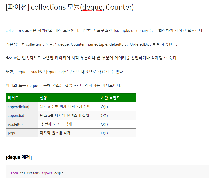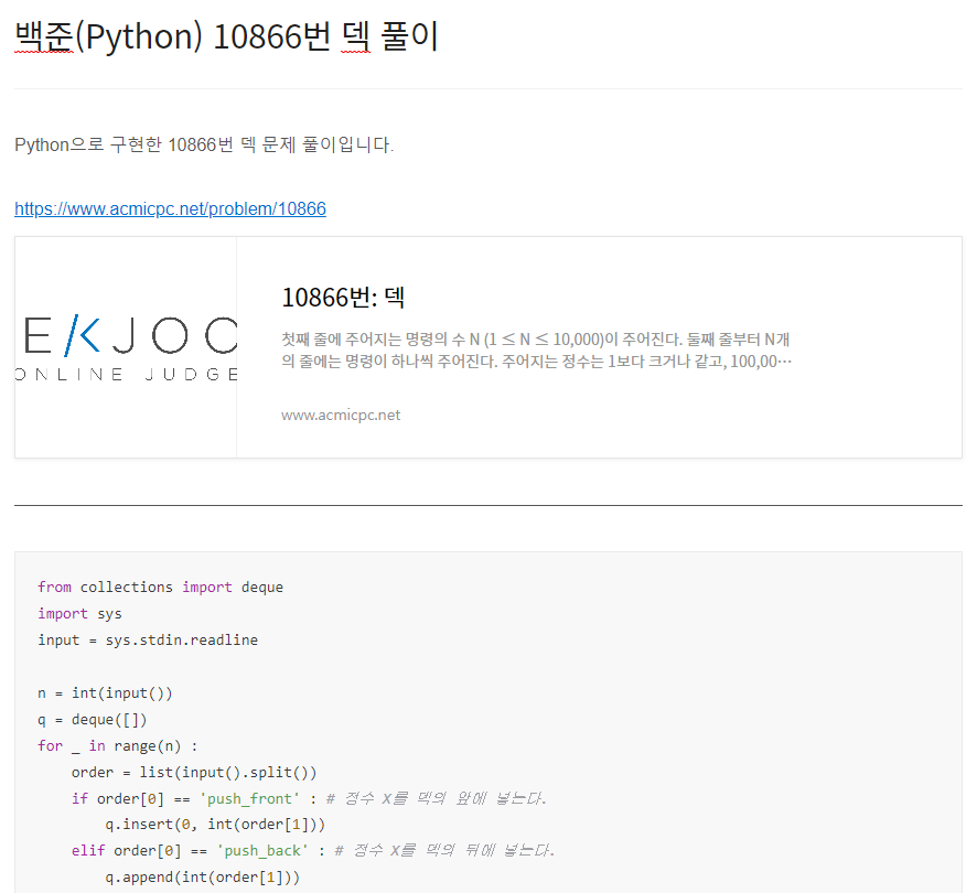 Python으로 구현한 10866번 덱 문제 풀이입니다. https://www.acmicpc.net/problem/10866 10866번: 덱 첫째 줄에 주어지는 명령의 수 N (1 ≤ N ≤ 10,000)이 주어진다. 둘째 줄부터 N개의 줄에는 명령이 하나씩 주어진다. 주어지는 정수는 1보다 크거나 같고, 100,000보다 작거나 같다. 문제에 나와있지 www.acmicpc.net from collections import deque import sys input = sys.stdin.readline n = int(input()) q = deque([]) for _ in range(n) : order = list(input().split()) if order[0] == 'push_front' : # 정..