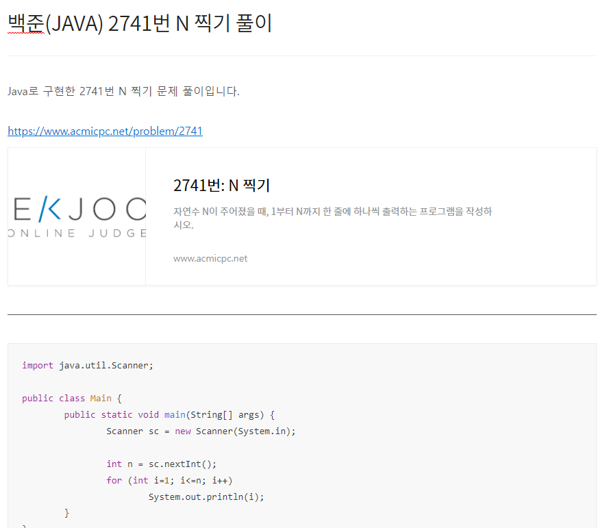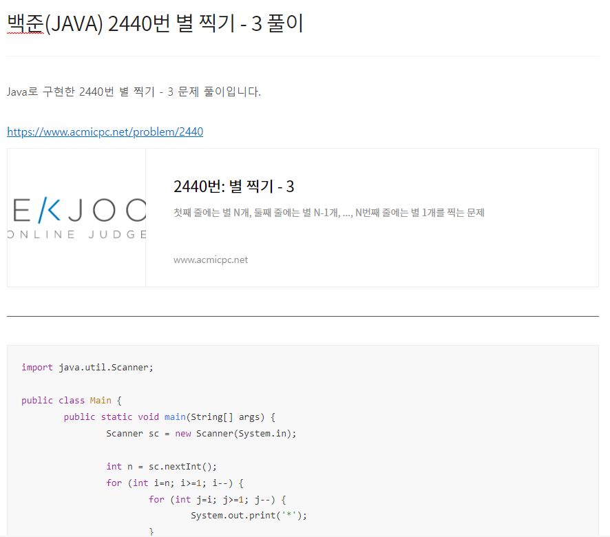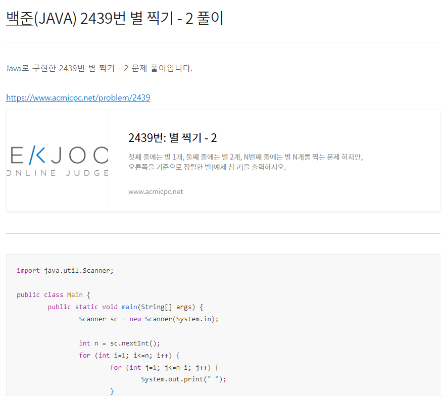 Java로 구현한 2441번 별 찍기 - 4 문제 풀이입니다. https://www.acmicpc.net/problem/2441 2441번: 별 찍기 - 4 첫째 줄에는 별 N개, 둘째 줄에는 별 N-1개, ..., N번째 줄에는 별 1개를 찍는 문제 하지만, 오른쪽을 기준으로 정렬한 별(예제 참고)을 출력하시오. www.acmicpc.net import java.util.Scanner; public class Main { public static void main(String[] args) { Scanner sc = new Scanner(System.in); int n = sc.nextInt(); for (int i=0; i
