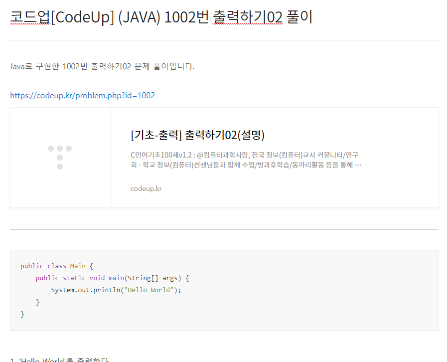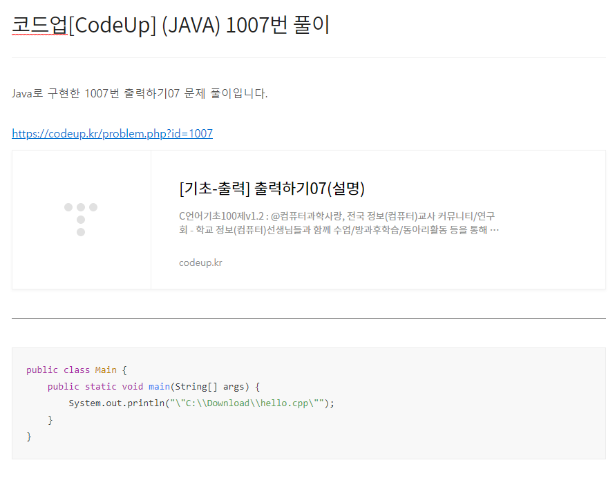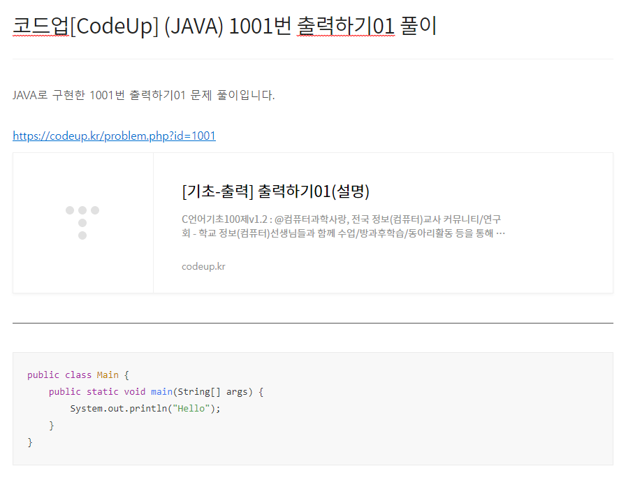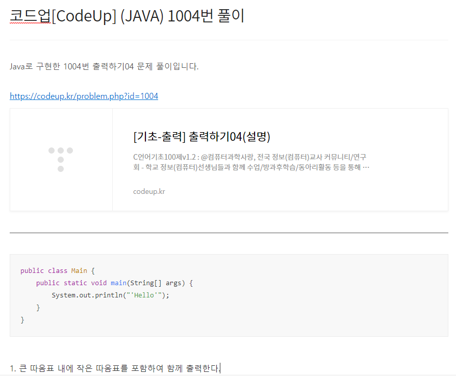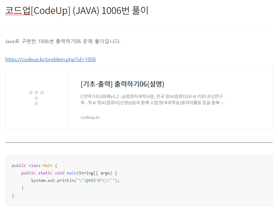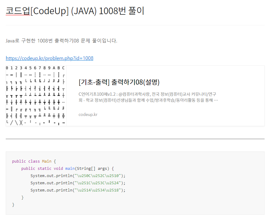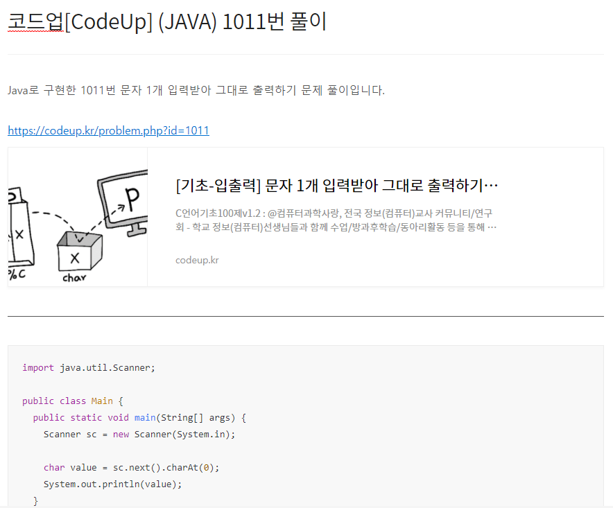 Java로 구현한 1011번 문자 1개 입력받아 그대로 출력하기 문제 풀이입니다. https://codeup.kr/problem.php?id=1011 [기초-입출력] 문자 1개 입력받아 그대로 출력하기(설명) C언어기초100제v1.2 : @컴퓨터과학사랑, 전국 정보(컴퓨터)교사 커뮤니티/연구회 - 학교 정보(컴퓨터)선생님들과 함께 수업/방과후학습/동아리활동 등을 통해 재미있게 배워보세요. - 모든 내용 codeup.kr import java.util.Scanner; public class Main { public static void main(String[] args) { Scanner sc = new Scanner(System.in); char value = sc.next().charAt(0); Sys..