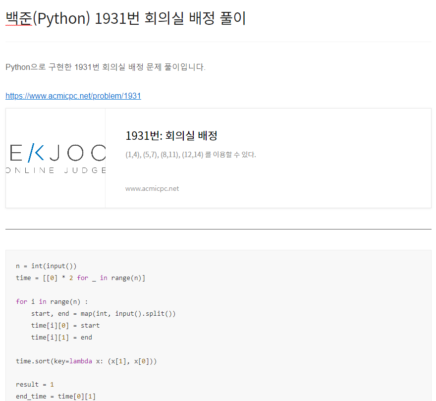 Python으로 구현한 1931번 회의실 배정 문제 풀이입니다. https://www.acmicpc.net/problem/1931 1931번: 회의실 배정 (1,4), (5,7), (8,11), (12,14) 를 이용할 수 있다. www.acmicpc.net n = int(input()) time = [[0] * 2 for _ in range(n)] for i in range(n) : start, end = map(int, input().split()) time[i][0] = start time[i][1] = end time.sort(key=lambda x: (x[1], x[0])) result = 1 end_time = time[0][1] for i in range(1, n) : if time[i][0..