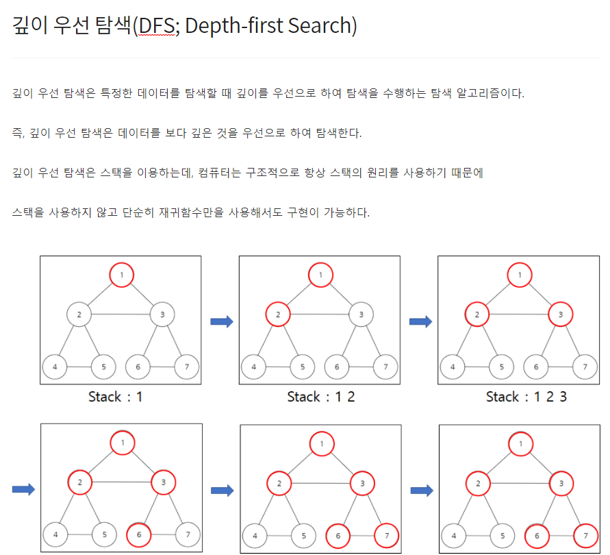 깊이 우선 탐색은 특정한 데이터를 탐색할 때 깊이를 우선으로 하여 탐색을 수행하는 탐색 알고리즘이다. 즉, 깊이 우선 탐색은 데이터를 보다 깊은 것을 우선으로 하여 탐색한다. 깊이 우선 탐색은 스택을 이용하는데, 컴퓨터는 구조적으로 항상 스택의 원리를 사용하기 때문에 스택을 사용하지 않고 단순히 재귀함수만을 사용해서도 구현이 가능하다. 그림과 같이 스택의 최상단 노드를 확인하고 해당 노드와 인접한 노드 중 방문하지 않은 노드를 스택에 넣고 방문처리한다. 그림에 대해 구체적으로 설명하자면, (1) 먼저 스택에 시작 노드인 1을 삽입하고 방문처리한다. (2) 1과 인접한 노드 중 방문하지 않은 2를 스택에 삽입하고 방문처리한다. (3) 2와 인접한 노드 중 방문하지 않은 3을 스택에 삽입하고 방문처리한다. ..