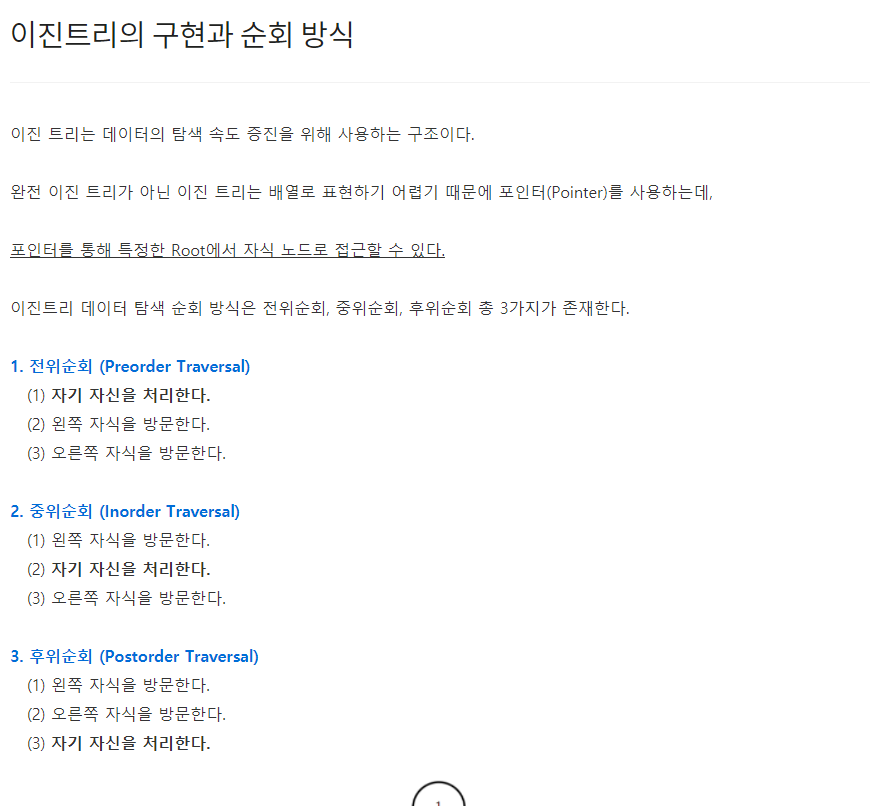 이진 트리는 데이터의 탐색 속도 증진을 위해 사용하는 구조이다. 완전 이진 트리가 아닌 이진 트리는 배열로 표현하기 어렵기 때문에 포인터(Pointer)를 사용하는데, 포인터를 통해 특정한 Root에서 자식 노드로 접근할 수 있다. 이진트리 데이터 탐색 순회 방식은 전위순회, 중위순회, 후위순회 총 3가지가 존재한다. 1. 전위순회 (Preorder Traversal) (1) 자기 자신을 처리한다. (2) 왼쪽 자식을 방문한다. (3) 오른쪽 자식을 방문한다. 2. 중위순회 (Inorder Traversal) (1) 왼쪽 자식을 방문한다. (2) 자기 자신을 처리한다. (3) 오른쪽 자식을 방문한다. 3. 후위순회 (Postorder Traversal) (1) 왼쪽 자식을 방문한다. (2) 오른쪽 자식을..